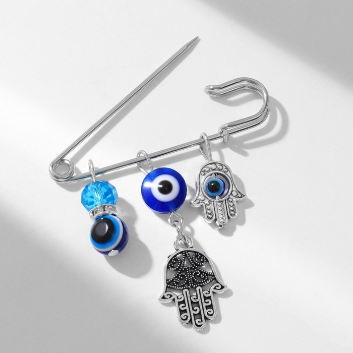 Погрузитесь в мир красоты и защиты с этой уникальной булавкой-оберегом, украшенной тремя подвесками в виде руки Хамса с бусиной. С длиной 5 см и элегантным сочетанием синего и серебряного цветов, она станет не только стильным дополнением к вашему образу, но и мощным символом защиты от негативной энергии.