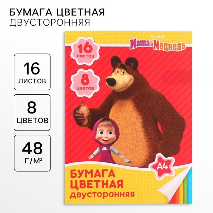 Бумага цветная, А4, 16 л., 8 цв., немел., 2ст, на скрепке, 48 г/м², Маша и Медведь 4377998