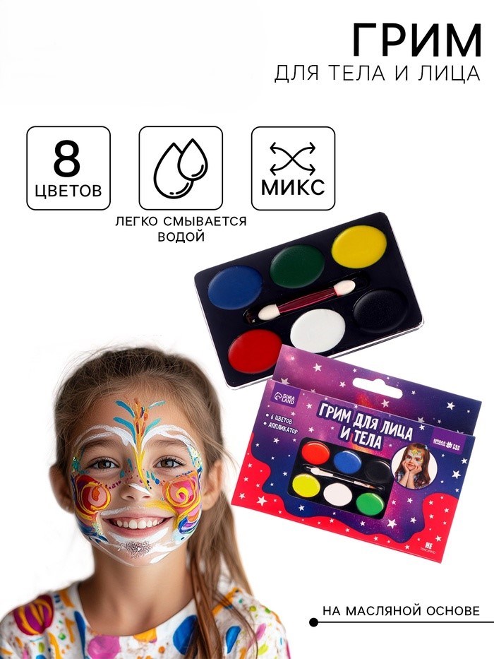 Аквагрим - уникальное средство для творчества на вашем лице и теле. Наш грим обладает яркими цветами, легко наносится и сохраняется на протяжении долгого времени. Аквагрим детский создан с использованием высококачественных ингредиентов, что обеспечивает яркие и насыщенные цвета. Грим для хобби и творчества легок в использование и гарантирует великолепные результаты. Аквагрим для лица абсолютно безопасен для кожи и не вызывает раздражения. Гримм для лица идеально подходит для различных мероприятий, вечеринок, макияжей. Декоративная палетка поможет создавать образы для хэллоуина, с помощью красок можно нарисовать и заменить тени. С помощью аквагрима вы можете воплотить свои самые смелые идеи и создать неповторимый образ на любой праздник, новый год, маскарад, ёлку в школе. Позвольте своей фантазии разгуляться и стать настоящим художником. И, конечно же, аквагрим станет отличным подарком для ребенка, дочке, сыну, внуку, внучке, сестре.