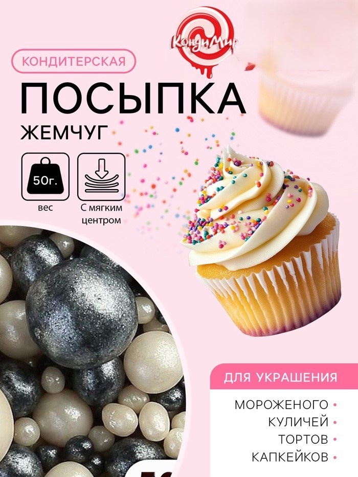 Кондитерская посыпка с мягким центром "Жемчуг" черно-белая, 50 г 5132236