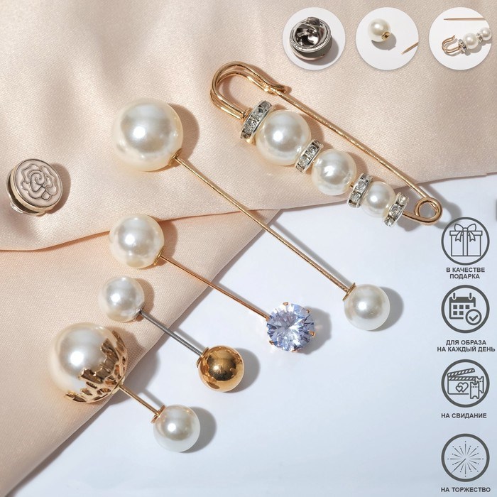 Набор булавок (6шт) «Жемчужное ассорти», 6,5см, цвет белый в золоте 7165050