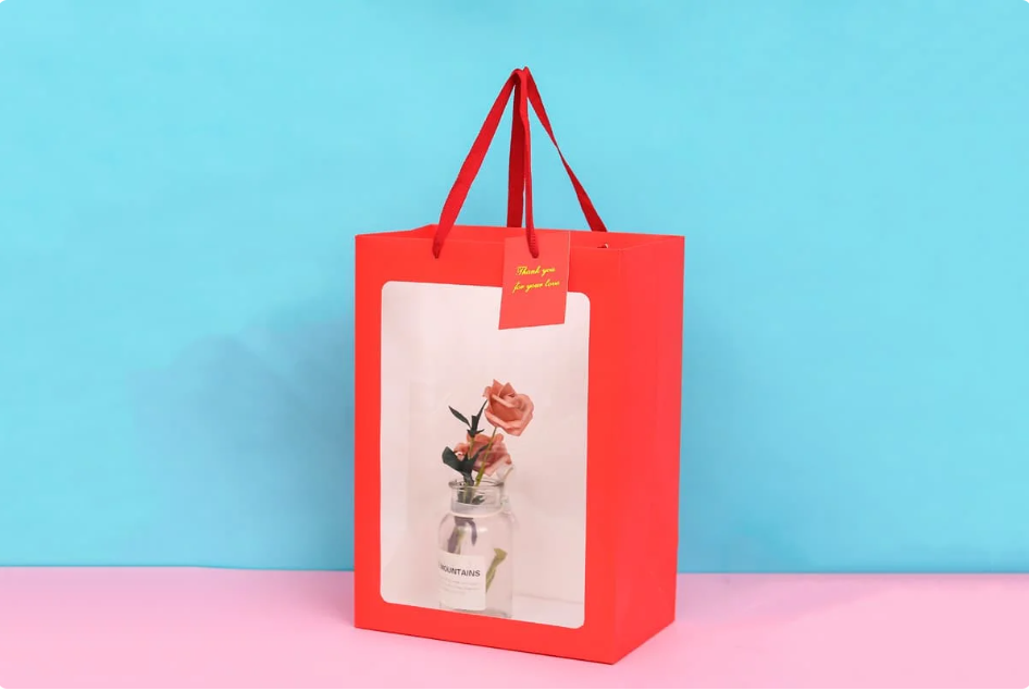 Пакет для цветов крафт плотный с окошком и ручками (25 x 15 x 35см, 10 шт) Красный, плотность 230 гр