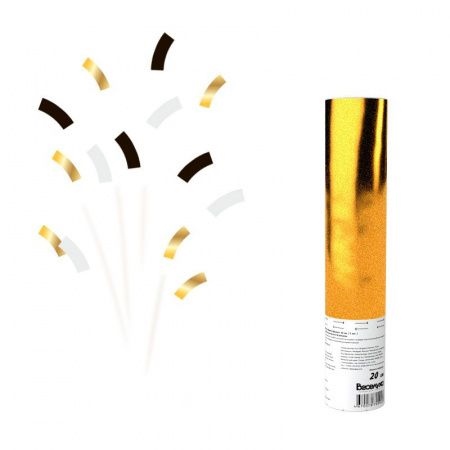 Наполнение хлопушки золотые фольгированные стримеры, бумажные стримеры белого и черного цвета – одно из самых эффектных наполнений для хлопушек. Сияние, блеск, роскошь выстрела поразят всех гостей. Длина выстрела данной хлопушки составляет 5-8 метров.