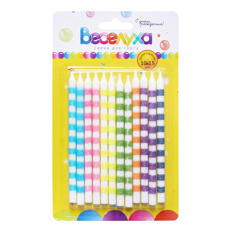 Свечи тортовые классические "Сверкающие полоcки" (Ассорти) с глиттером с держателями /12 шт.,13 см /