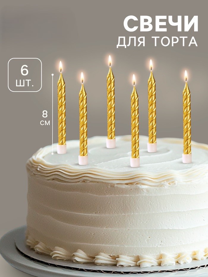 Свечи в торт с подставками, золотые, средние, набор 6 шт, 8 см 1670293